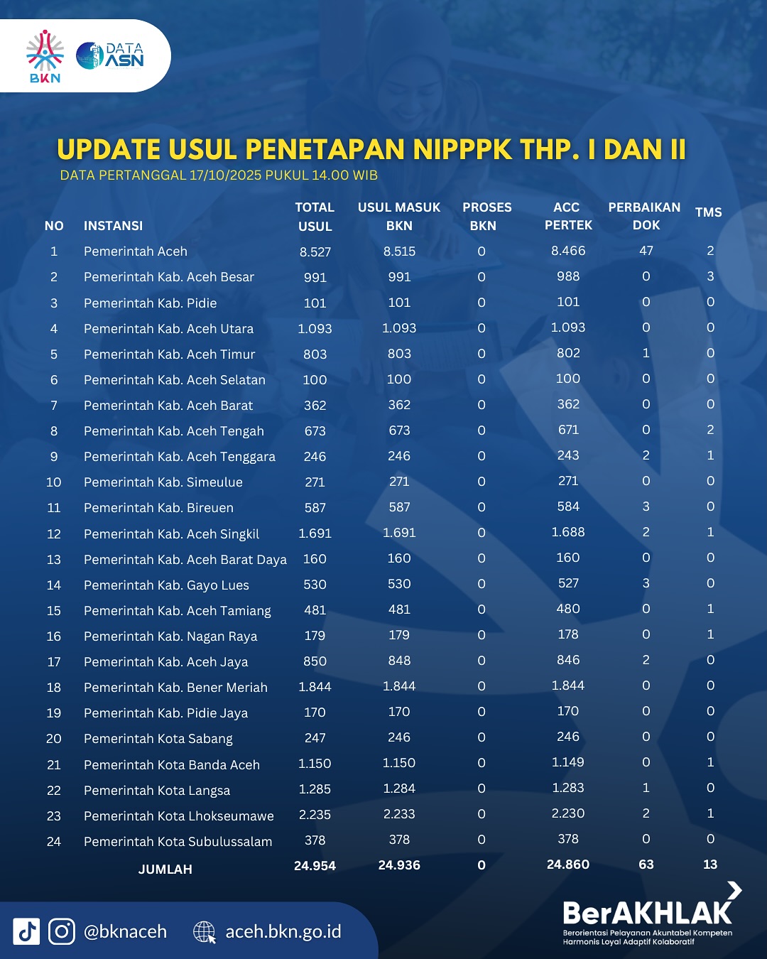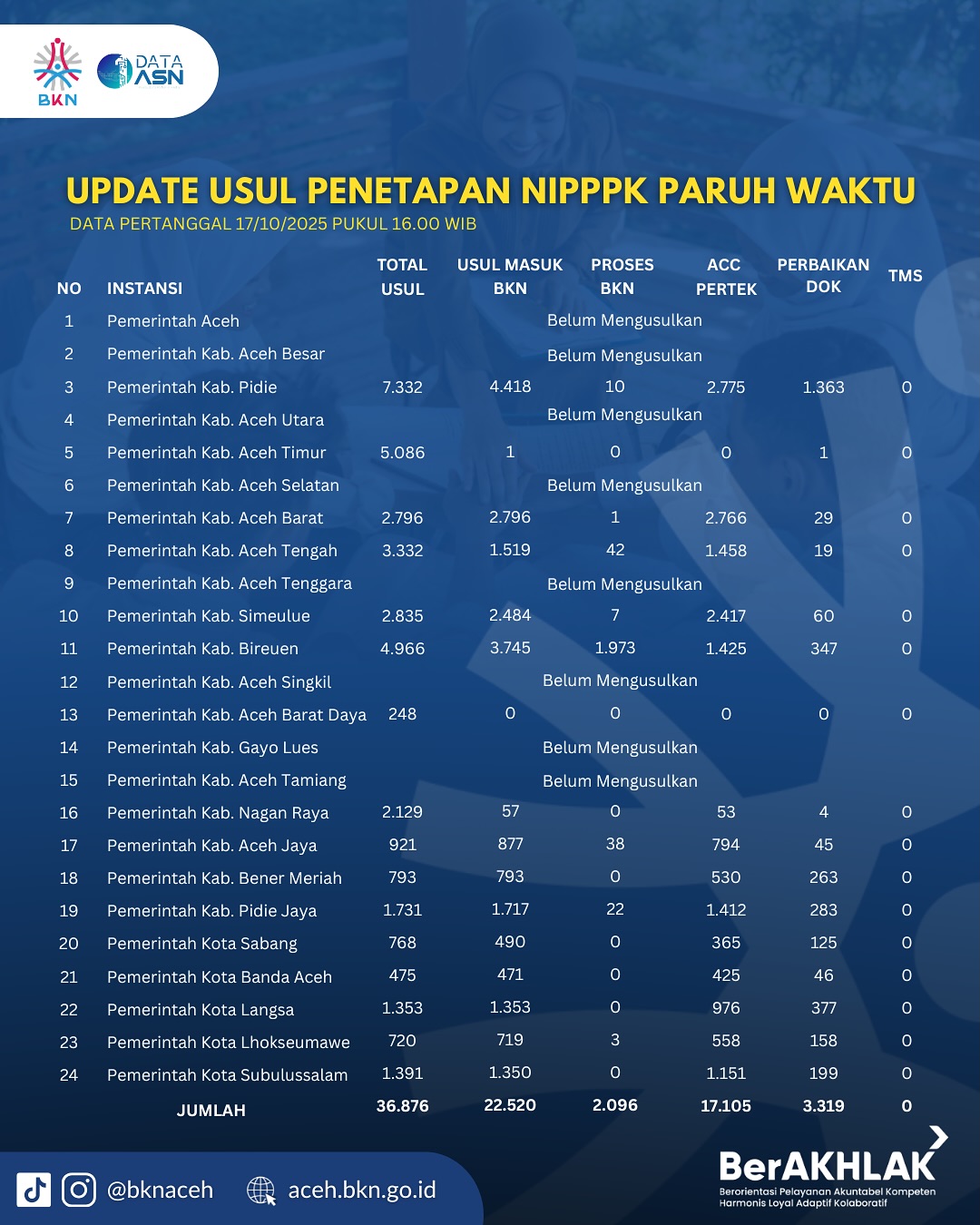 Update Penetapan NI PPPK Tahap 1 dan 2 Serta PPPK Paruh Waktu Kanreg XIII BKN Aceh Per 17 Oktober 2025