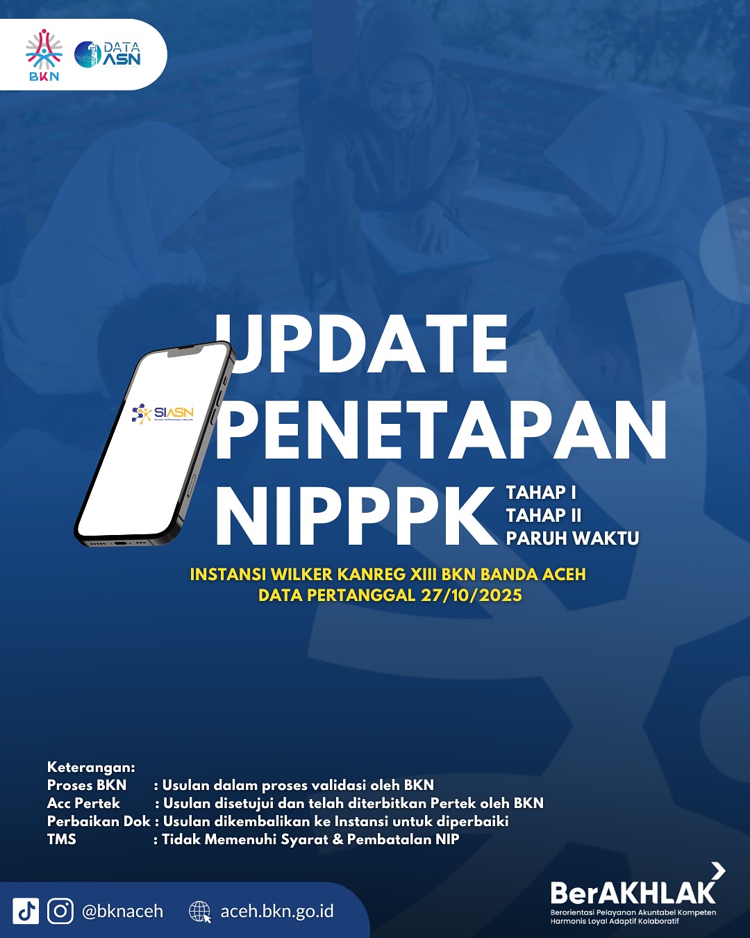 Update Penetapan NI PPPK Tahap 1 dan 2 Serta PPPK Paruh Waktu Kanreg XIII BKN Aceh Per 27 Oktober 2025